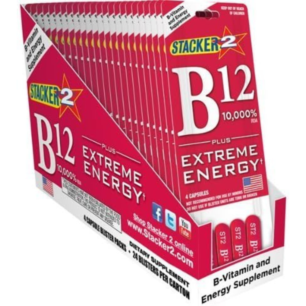 B12 EXTREME ENERGY 10,000% 4 CAPSULES /CARD 24 CARDS/DISPLAY (96 CAPSULES) Vitamin B12 is a water-soluble vitamin which performs a key role in regulating the brain and nervous system. B12 also supports the formation of red blood cells, which carry oxygen from the lungs to the rest of the body.+ Vitamin B12 helps to maintain the proper metabolism of protein, fat and carbohydrates.+ This synergistic blend of B-Vitamins, L-Tyrosine and Caffeine supplies an extreme boost of energy. B12 10,000% plus Extreme Energy Maintaining good health is essential these days; it requires a life style of exercise, rest and healthy eating. Healthy eating helps you acquire the vitamins and minerals you need to develop a strong immune system. However eating healthy is not always easy. That’s why Stacker 2 has developed a new shot to help supplement what you may be missing in your daily diet. Stacker 2 Energy Shot B12 provides 10,000% of the recommended daily value of vitamin B12. B12 is a water-soluble vitamin that plays an important role in supporting the formation of red blood cells.