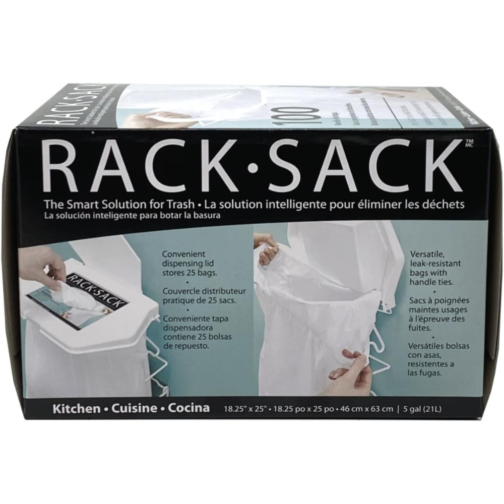 Rack Sack Bags are versatile and leak-resistant bags with handle ties to fit securely to the Rack Sack Frames. The refill Kitchen Rack Sack Bags are designed to fit the 3 or 5 gallon Kitchen Rack Sack frame (new frame design after 2006). These bags will still work in older (prior to 2006) frames, however they come in a package not a roll. 100 bag count includes four 25 count refill packs that will fit inside the dispenser lid for easy access. Size of bags: 18.25″ x 25″. 5 Gallon