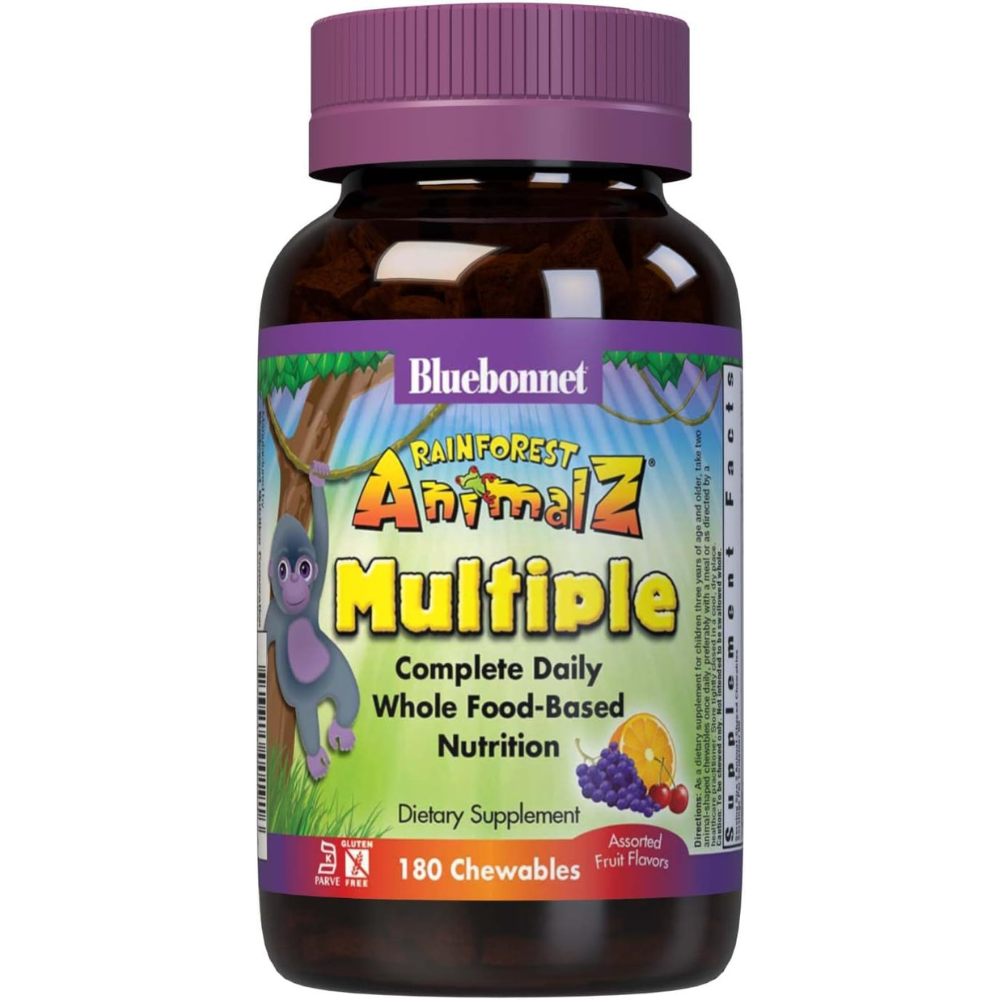 If children grew up in the rainforest, they’d get most of the nutrients for proper growth and development from whole foods like fruits, vegetables, whole grains and fish. Nutrients that are often missing from today’s diets. Bluebonnet Super Earth Rainforest Animalz Whole Food Based Multiple Animal-Shaped Chewables helps bridge this nutrient gap by providing a comprehensive blend of super fruits and veggies that are rich in essential vitamins and minerals in tasty, delicious flavored chewable tablets to support their growth and developmental needs.Directions: As a dietary supplement for children three years of age and older, take two animal-shaped chewables once daily, preferably with a meal or as directed by a healthcare practitioner.
