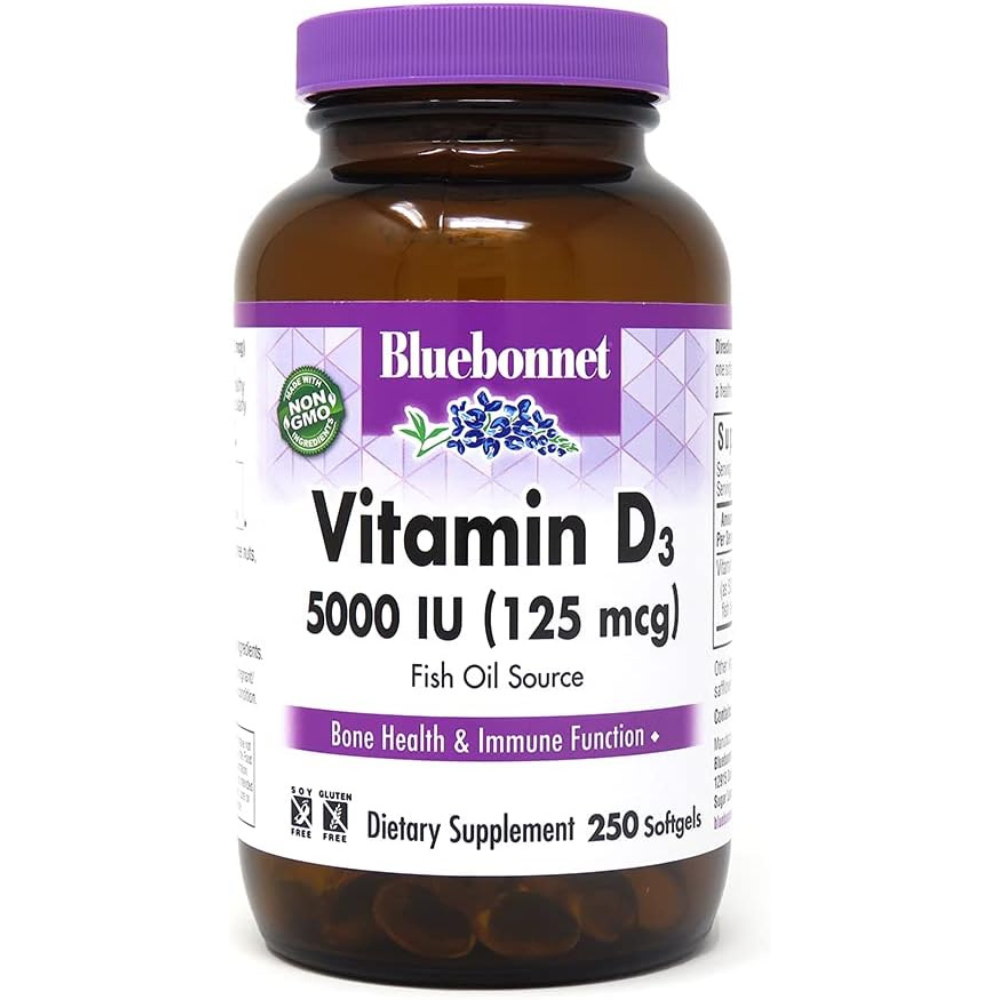 BlueBonnet Nutrition Vitamin D3 5000 IU Softgels, Aids in Muscle and Skeletal Growth, Cholecalciferol from Fish Oil, Non GMO, Gluten Free, Soy Free, Dairy Free, Yellow, 250 Softgels