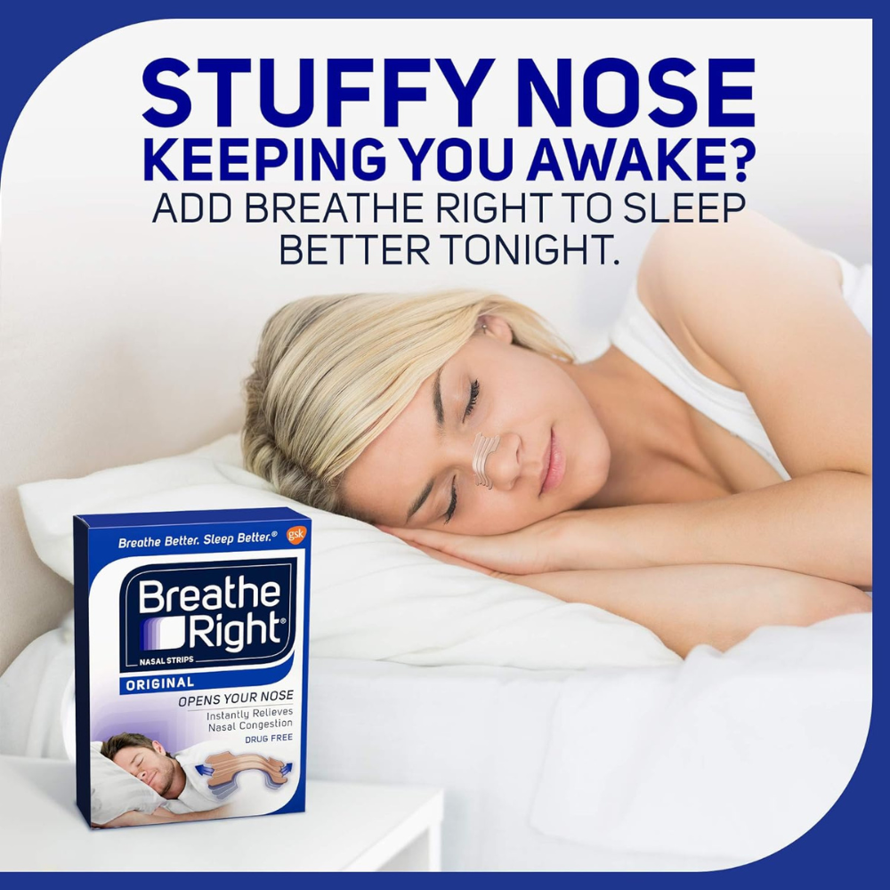 Try Breathe Right and sleep better tonight. Breathe Right Original Tan Nasal Strips are easy-to-use, and provide effective nighttime nasal congestion relief. Breathe Right Strips provide drug-free, non-prescription relief to keep you breathing easy all night. Breathe Right strips open your nose up to 38% more than allergy medicines alone* and can help you reduce or even stop nasal snoring. That’s why millions of people around the world use Breathe Right nasal strips to breathe better so they can sleep better. Nasal congestion due to colds and allergies can make breathing difficult, especially at night. Breathe Right nasal strips are made of flexible spring-like bands that widen the air passages in the nose to provide relief for congestion due to colds, allergies, or a deviated septum, and reduce nasal snoring caused by nighttime nasal congestion. *vs decongestant sprays alone