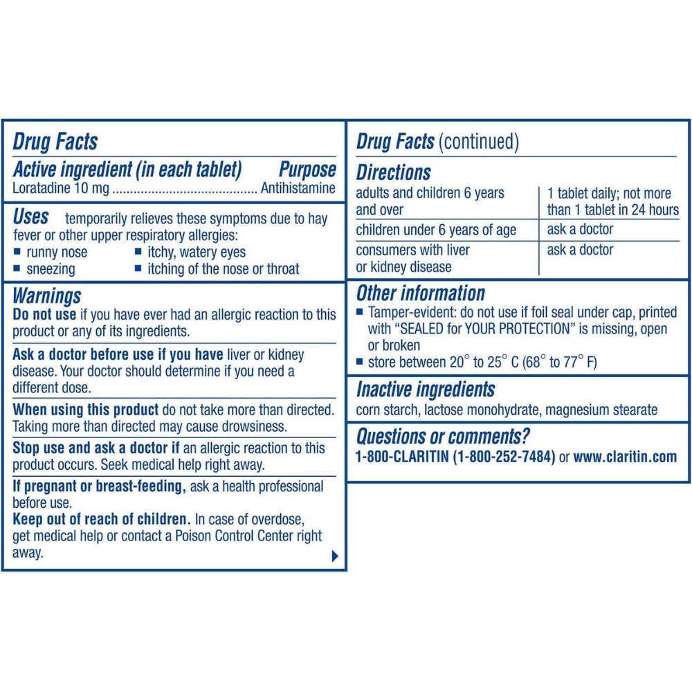 Claritin 24 hour non drowsy allergy tablet. Non drowsy allergy relief. 24 hour relief. Take daily when allergy symptoms occur.Non-drowsy relief against pollen, mold, dust and pets, temporarily relieves runny nose, sneezing, itchy, watery eyes, and itchy nose or throat.