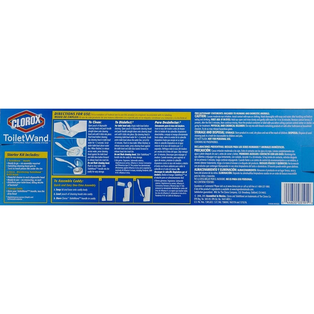 The Clorox ToiletWand System cleans what a traditional toilet brush leaves behind. This starter kit includes one ToiletWand handle, 6 single-use disposable cleaning head refills and a storage caddy that provides a convenient place for your Clorox ToiletWand System when you aren’t using it. The disposable cleaning head preloaded with Clorox toilet bowl cleaner attaches to the ToiletWand handle to power through tough stains while killing 99.9% of germs like staphylococcus aureus, salmonella enterica, rhinovirus type 37 and influenza A. The spongy head conforms to surfaces and scrubs hard-to-reach places, even under the rim. Just click a disposable toilet cleaning head in place, swish the toilet bowl and toss the head into the trash bin when you’re done. You’ll no longer need to store a germ-ridden toilet brush. Click, swish and toss your way to a clean toilet with the Clorox ToiletWand Disposable Toilet Cleaning System.