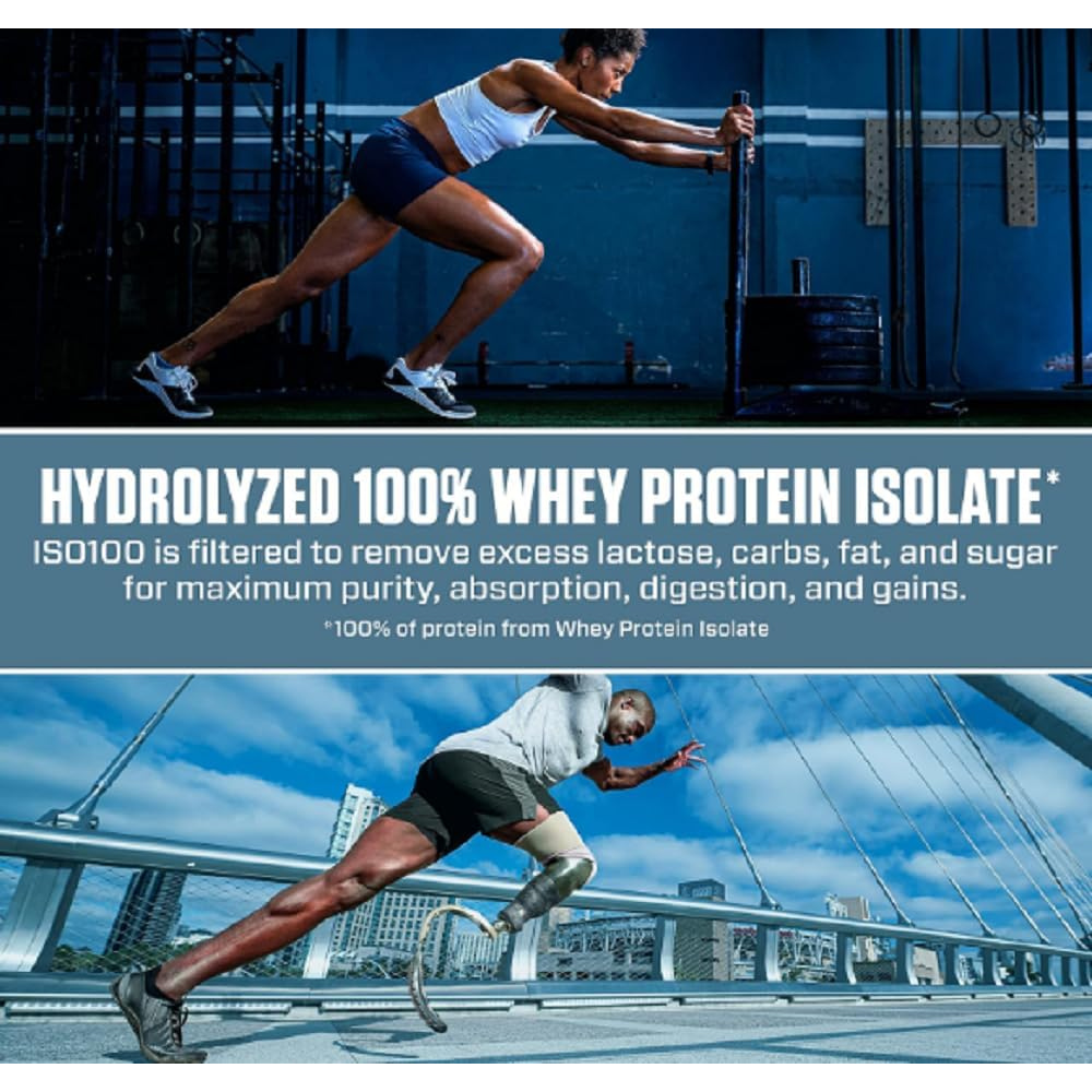 Dymatize ISO100 derives its name from its protein source, 100% Whey Protein Isolate. Unless you are in the medical profession, you have probably never seen protein like this before.Most companies “claim” they use Whey Protein Isolate, but after one serving of Dymatize ISO100 you can instantly see, taste and even feel the difference! This Whey Protein Isolate has been processed to the zenith of perfection, 100% hydrolyzed and instantized and taken through no less than 5 quality controlled steps. Both lactose and fat have been removed from ISO100, leaving you with nothing but the most easily digested, assimilated and most bio-available source of protein on the market.It’s known that maximum protein utilization is essential to aiding muscle recovery and maintaining a positive nitrogen balance, which is critical during periods of intense training. There is no higher standard of protein than ISO100, so feel confident that you will be feeding your muscles to their fullest potential!Check the stats: each serving has an astonishing 24 grams of protein, with “1” Carb & “0” Fat. Look closer. You will see that all this is in a serving size of about 28 grams, making ISO100 86% protein by weight! Nothing out there matches this formula, nothing even comes close.The meticulous processing of Dymatize Whey Protein Isolate gives you “instant mixability” in its true form. You won’t believe how quickly Dymatize ISO100 goes into solution. And, because of its ultra-purity and zero lactose, Dymatize ISO100 could be the easiest protein to digest on the market today.Don’t forget, with “1” carbohydrate, Dymatize ISO100 is perfect for low carb diets.