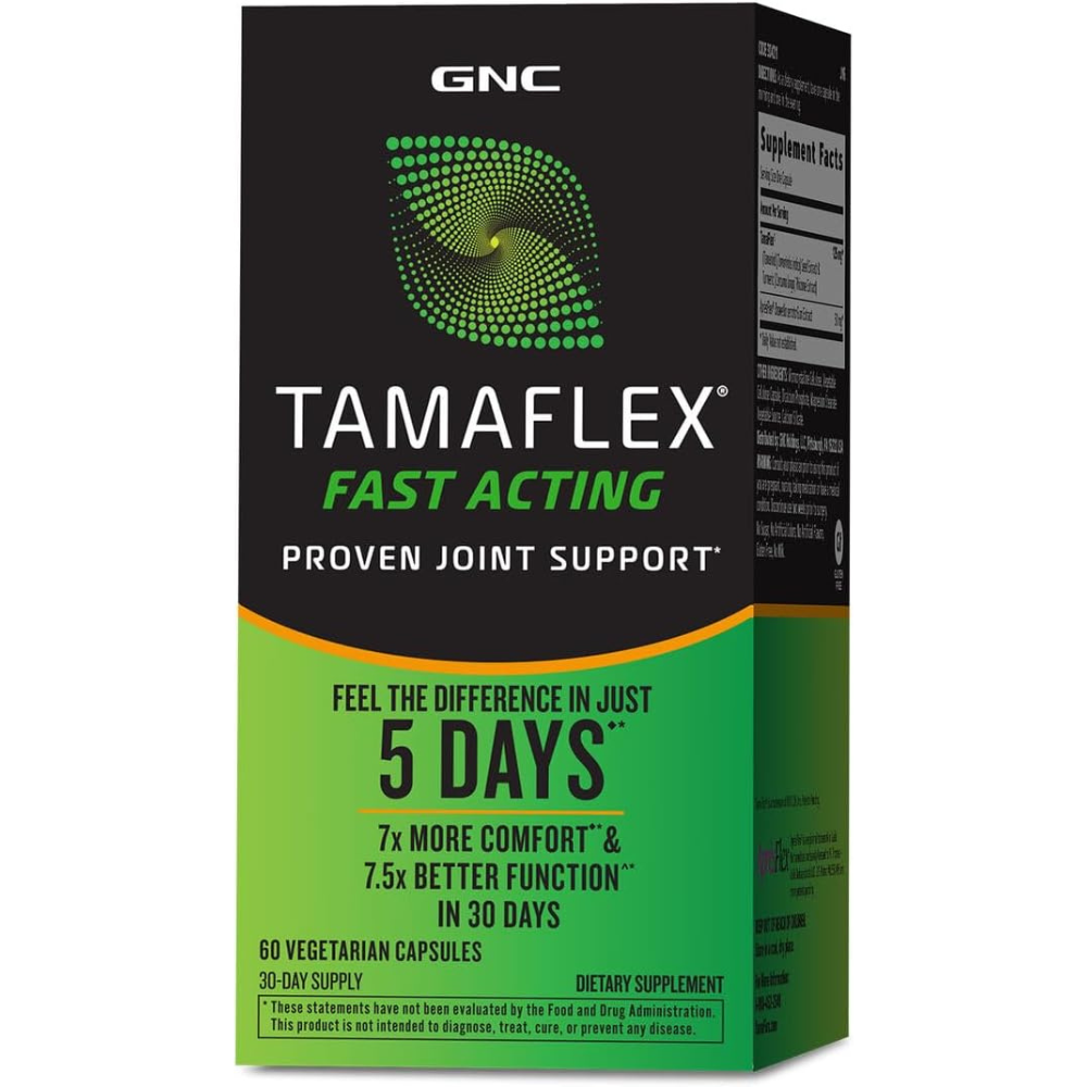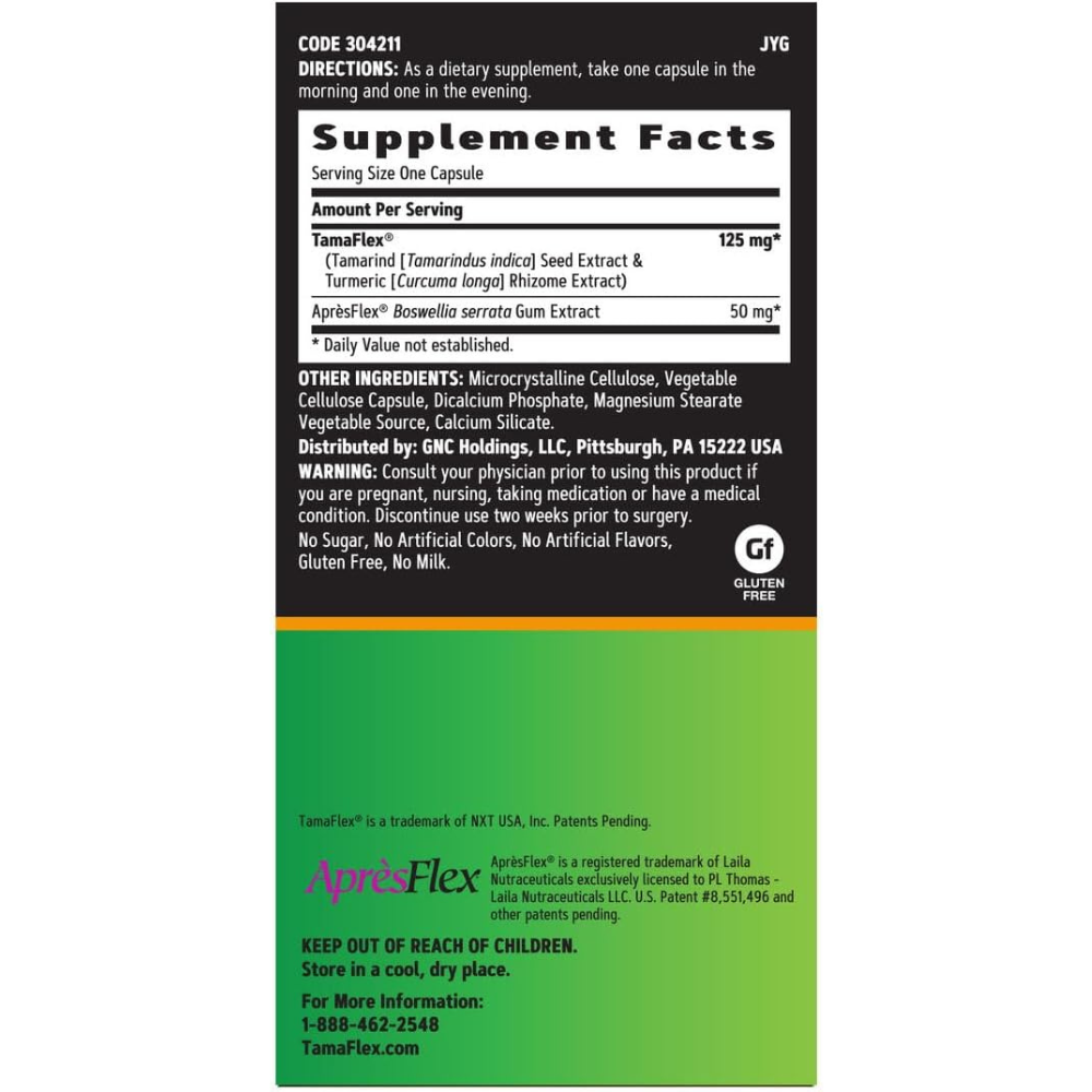 GNC TamaFlex Fast Acting Proven Joint Support: Provides 7x More Joint Comfort In One Month◆ For centuries, traditional Ayurvedic preparations have used the power of turmeric and tamarind seed. Now, GNC has formulated a powerful, unique botanical blend that combines these ingredients, along with AprèsFlex made from boswellia serrata, into just two small pills a day to give you GNC TamaFlex Fast Acting. TamaFlex Fast Acting represents a breakthrough in joint health and comfort proven to help you