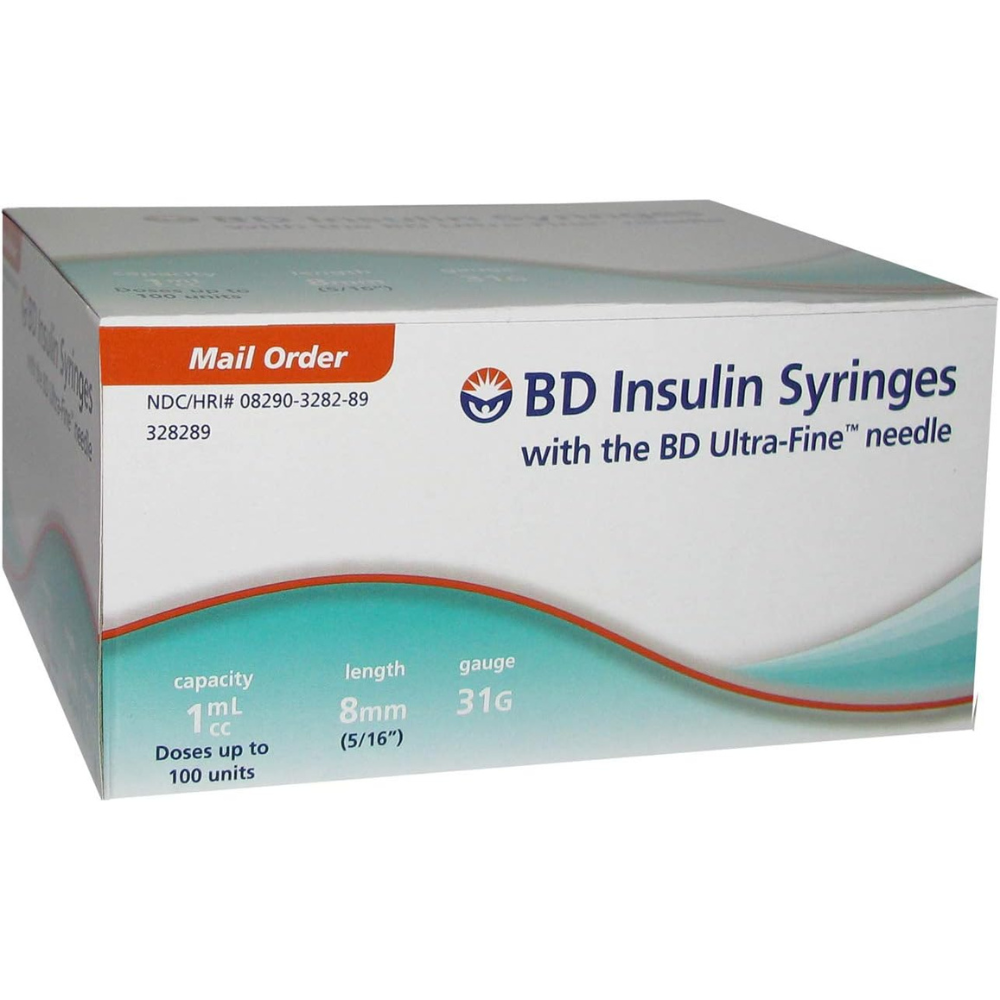 BD Ultra-Fine Insulin Syringes 1cc – Short Needle For 100 units or less 31 gauge 5/16″ (8 mm) needle This product has 9 packs(90).