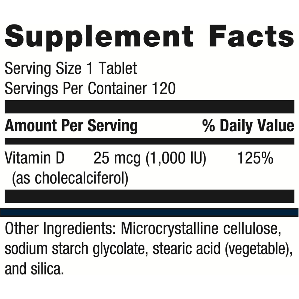 Vitamin D3: Each tablet provides 25 mcg (1000 IU) of vitamin D3, providing 125% of the Daily Value