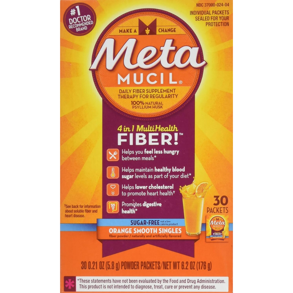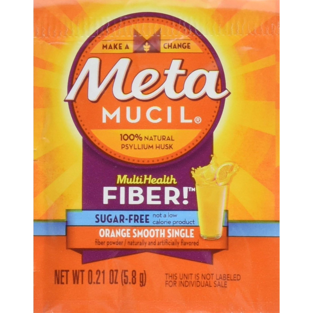 Meta Mucil 4 in 1 MultiHealth Fiber Supplement Powder Sugar Free Orange Smooth. Laxative: For relief of occasional constipation (irregularity). This product generally produces bowel movement in 12 to 72 hours. Supplement: Helps you feel less hungry between meals.* Helps maintain healthy blood sugar levels as part of your diet.* Helps lower cholesterol to promote heart health.** Promotes digestive health.* Fiber singles are pre-measured and ready to mx and enjoy as directed wherever you are – at home, in the office or on the go. It�s a portable way to help your body gen an extra serving of 100% natural psyllium fiber every day. Gluten free (may contain trace amounts less than 20 ppm). If you have specific dietary needs, you should consult your doctor before consuming this product. *These statements have not been evaluated by the Food and Drug Administration. This product is not intended to diagnose, treat, cure or prevent any disease. **Diets low in saturated fat and cholesterol that include 7 grams of soluble fiber per day from psyllium husk, as in this product, may reduce the risk of heart disease by lowering cholesterol. One serving of this product has 2.4 grams of this soluble fiber. Consult a doctor if you are considering use of this product as part of a cholesterol-lowering program.