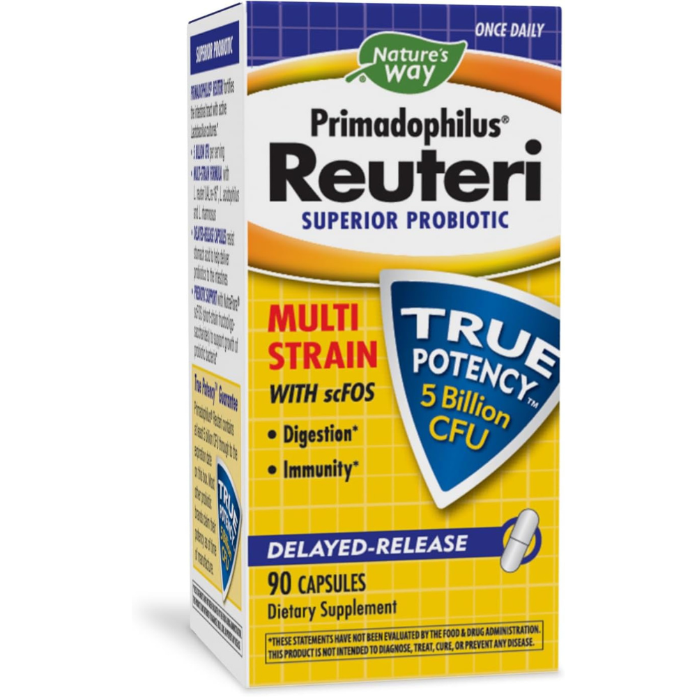 Primadophilus Reuteri Probiotics by Nature’s Way is formulated to help you find your way to wellness. It is a probiotic that features a multi-strain probiotic formula with a potency of 5 billion CFU per serving. With Lactobacillus reuteri UALre-16TM, L. acidophilus DDS(R)-1, and L. rhamnosus UALr-18TM, these probiotics are designed to support immune and digestive health.* DDS(R) is a registered trademark of UAS Laboratories LLC and used under license. Primadophilus Reuteri also contains plant-based prebiotic NutraFlora(R) scFOS, food for good baceteria.* NutraFlora(R) is a registered trademark of Ingredion.