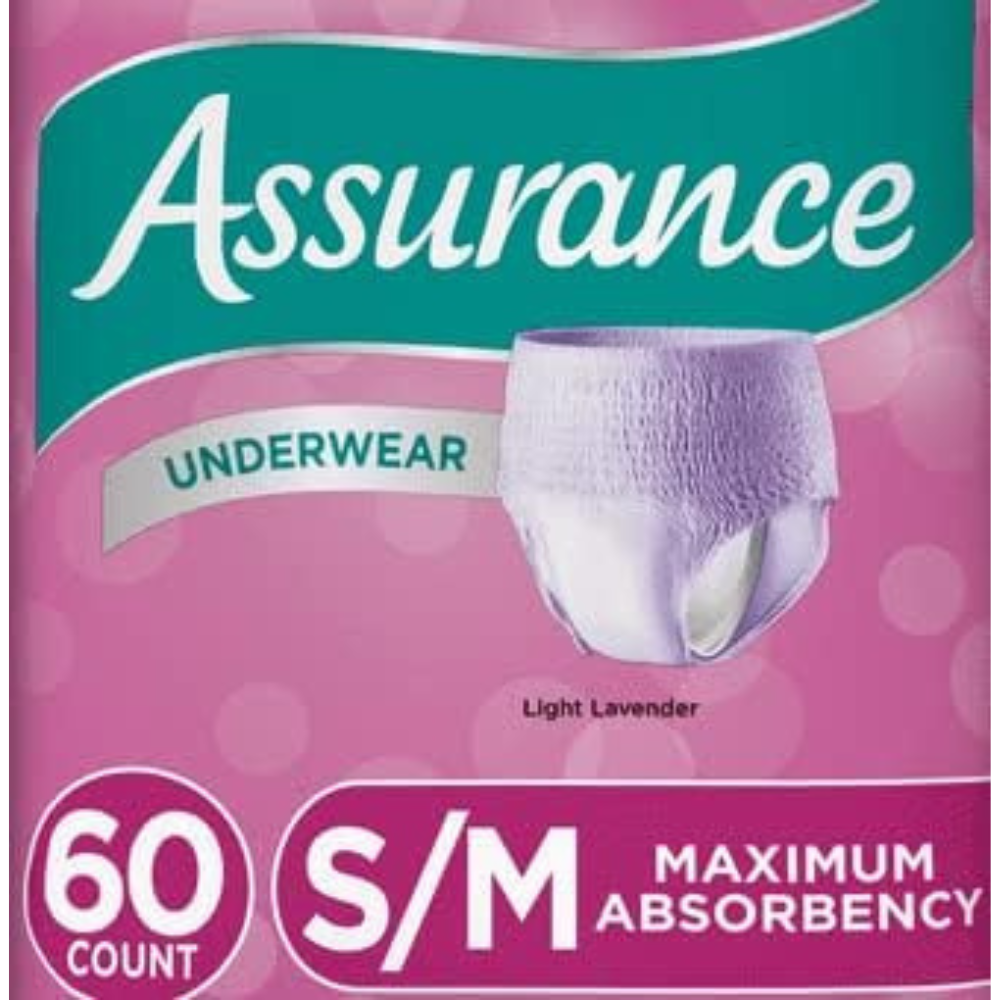 Feel comfortable and dry while living your active, on-the-go lifestyle with Assurance for Women Maximum Absorbency Underwear. They are designed specifically for women and feature Comfort-Shape protection for a soft and unobtrusive fit. These women’s underwear have a form-fitting shape and stretchable, breathable waist panels for containment and protection that does not sacrifice comfort. Each one is designed for maximum absorbency and will lock away wetness on contact. They are also equipped with Omni-Odor Guard that helps control odor and neutralize it to provide you with discreet protection. This is a 60-count package of disposable small/medium Assurance underwear in a soft lavender tone. They are soft and easy to use and are made from a breathable material that will stay cool and comfortable next to your skin. These women’s underwear are ideal for both daytime and nighttime use and are made to fit waist sizes that are 28″ to 40″ in diameter.