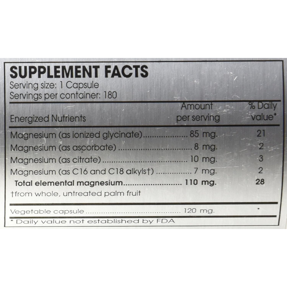 Mg PLUS GUARD 180 VCAPS DIETARY SUPPLEMENT Directions: As a dietary supplement take one (1) to six (6) capsules daily with meals or as directed by your health professional. Severe condition: 4-12 capsules daily SUPPLEMENT FACTS Serving size: 1 Capsule Servings per container: 180 Amount Per Serving Magnesium (as ionized glycinate) 85 mg Magnesium (as ascorbate) 8 mg Magnesium (as citrate) 10 mg Magnesium (as C16 and C18 alkyls ) 7 mg Total elemental magnesium from whole untreated palm fruit 110 mg Vegetable capsule 100 mg Other ingredients: None Pure hypoallergenic components Fully bioactive Organic base Biochemically formulated Includes cofactors that are usable in generating high-energy compounds Vitamins minerals synergistic cofactors DOES NOT CONTAIN: citrus MSG wheat gluten corn starch sugar soy yeast zein sulfate phosphates (other than coenzymes) preservatives casein or other milk derivatives No GMOs CONTAINS ONLY PERQUE MAGNESIUM FORMS. NO FILLERS BINDERS OR EXCIPIENTS USED. KEEP OUT OF REACH OF CHILDREN. Must be stored with cap on tightly in a cool dry place. Do not use product if the tamper-resist shrink band around the cap or the inner seal beneath the cap appears to have been tampered with or is missing. WARNING: Pregnant and nursing mothers need to check with their health professional before taking supplements.