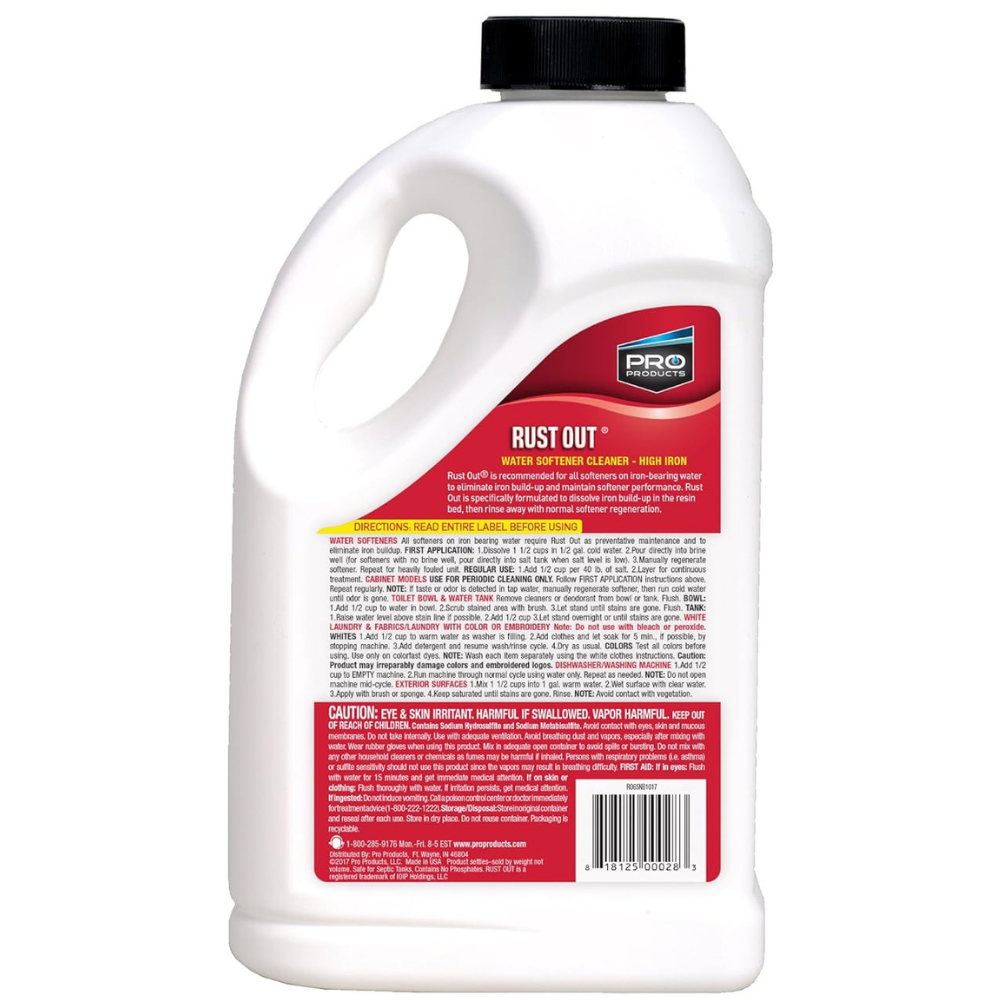 Rust Out softener rust remover chemically removes iron and rust build-up that coats the resin beds and fouls the softener. This iron build-up is not totally removed during normal regeneration of a water softener. Using Rust Out softener rust remover in a water softener will eliminate rust and foreign matter from the resin bed which increases the life of the softener and reduces rust staining on household fixtures and other surfaces. We recommend using the softener rust remover regularly as preventative maintenance to ensure the softening and recharging efficiency of the softener’s resin bed. Additionally, in applications where iron is present you can use our well water formula to fight annoying rust stains.