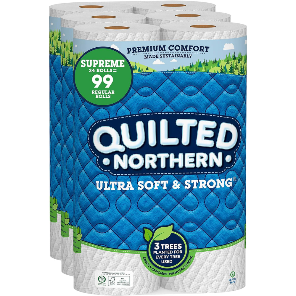 Each pack contains 24 Supreme Rolls of Quilted Northern Ultra Soft & Strong toilet paper