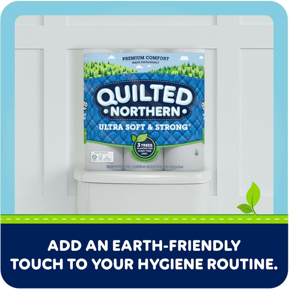 Strong, comfy & sustainably made. We think everything should feel comfortable about your toilet paper, including the way you feel about your impact on the environment. Quilted Northern Ultra Soft & Strong toilet paper is the perfect blend of sustainability and premium comfort, with two soft layers that flex and hold up, all created using responsible manufacturing practices.