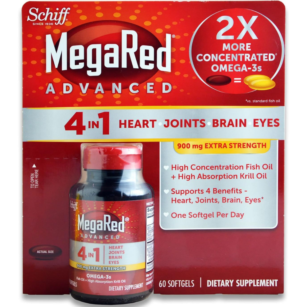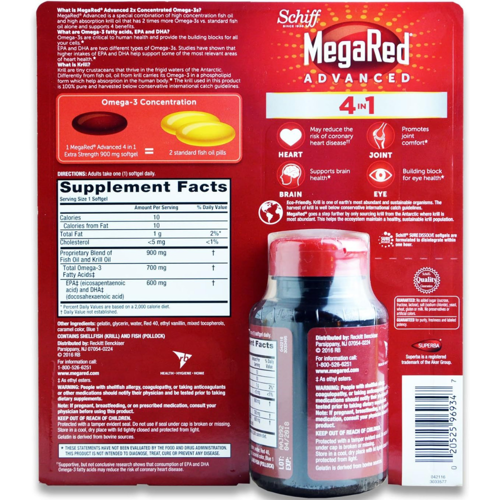 MegaRed Advanced is a special blend of highly concentrated fish oil and highly absorbed krill oil that has 2x more Omega-3s than standard fish oil alone and supports 4 benefits. MegaRed Advanced 4-in-1 may reduce the risk of coronary heart disease, promote joint comfort, support tick health, and is a fundamental element of eye health.