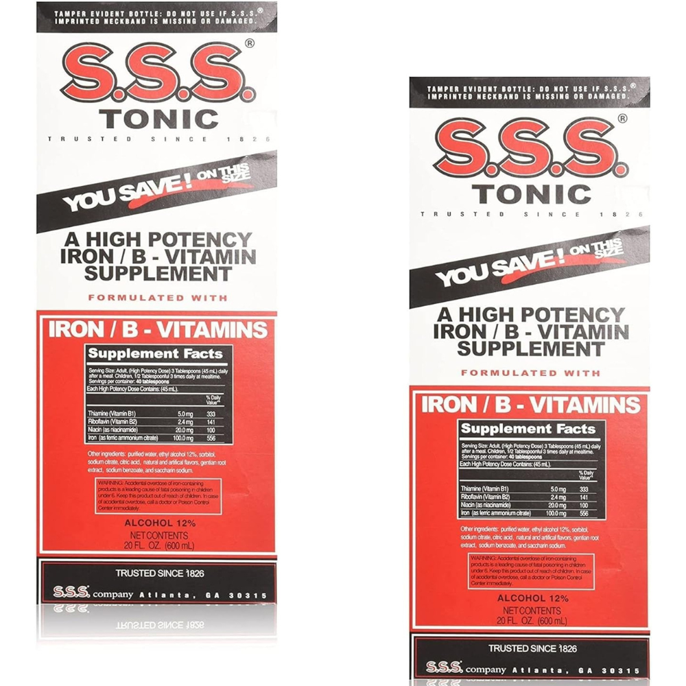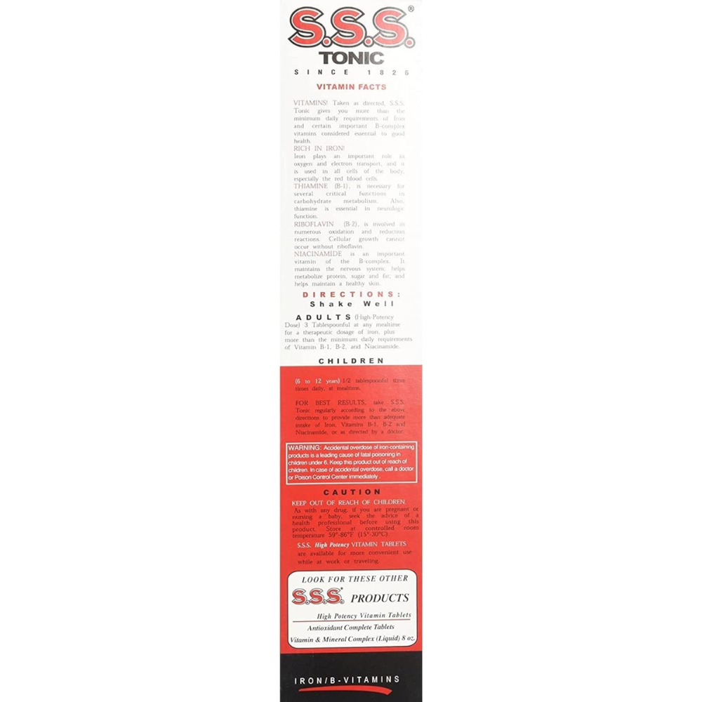 Sss Company Sss Company S.S.S. Tonic Liquid Large, Large 20 oz (Pack of 2) – S.S.S Tonic will help you improve your diet by giving you the right amount of vitamins you need every day for good health. If you are tired, this High Potency Tonic will give you a lot of energy because every cell in the body needs iron and vitamins to feel good. If you take S.S.S. Tonic as directed, it gives you more iron and B complex vitamins than you need in a day. Your body will notice the change. High-Potency B Vitamins (B1, B2, and Niacin) and Iron are put into S.S.S. Liquid Tonic, which is a liquid that is easy to digest and can help you when you don’t have enough nutrients. Women, men, and growing children who don’t get enough iron and vitamins from their food can all use this great formula. Dosage: Adults: 3 Tablespoonfuls at any mealtime daily. Children: 1/2 tablespoonful three times daily.