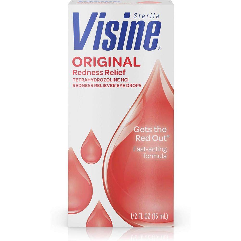Visine Original Redness Relief Eye Drops Gets the Red Out, fast and works in 60 seconds. The fast-acting, redness relieving formula with 0.05 percent tetrahydrozoline hydrochloride reduces red eye due to minor irritation caused by smoke and other airborne pollutants, a poor night’s sleep, or staring at a computer screen for long periods of time. From Visine a brand backed by 60 years of science and expertise, these eye drops offer quick and effective eye redness relief. The small 0.5-fluid ounce bottle easily slips into a bag or purse, so you can relieve your red eyes anywhere, even on-the-go.
