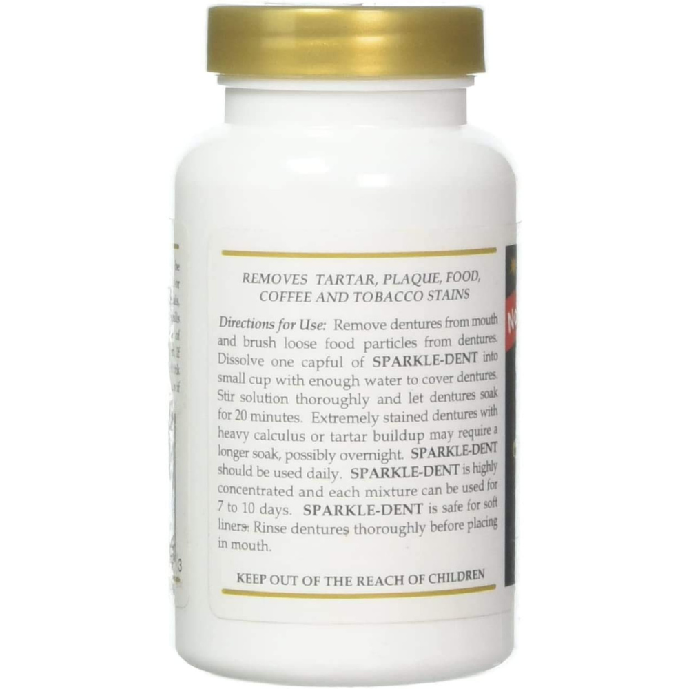SPARKLE DENT : SPARKLE-DENT REMOVES tartar, calculus, plaque, coffee and tea stains from dentures. EASY TO USE AND ECONOMICAL – Soak appliance for 15 minutes. Solution can be used for a full week of cleaning. Soaking time may increase for excessively stained appliance. ONE BOTTLE CLEANS FOR FULL 5 MONTHS.