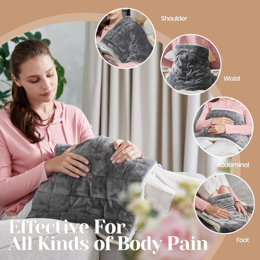SOFT MATERIAL : 220gsm flannel + 220gsm sherpa. The double sides of the weighted heating pad are made of skin-friendly cozy flannel, which is super soft, comfortable, and not allergic to your skin, which is more comfortable, and the heating pad is suitable for back pain relief, heating pads for cramps, heating pad for neck and shoulder for sleeping, watching TV, reading and relaxing on bed or sofa, working in office.