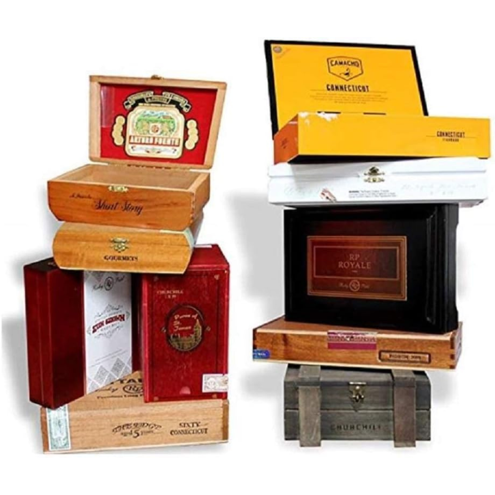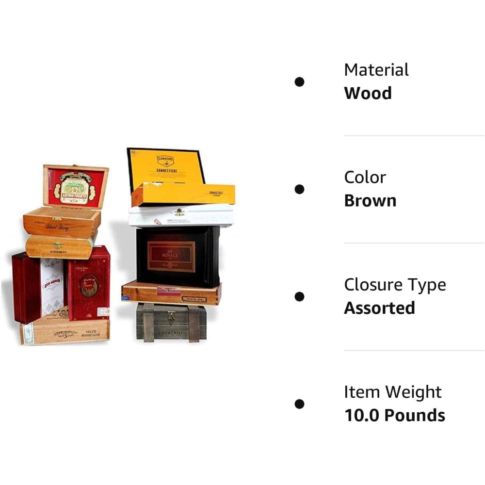 10 Empty Wooden Cigar Boxes No Tobacco an No cigars included ;Styles and sizes will vary from ones shown. Contact seller prior to purchase for special requests Change Manufacturer: from Cheaphumidors to Generic