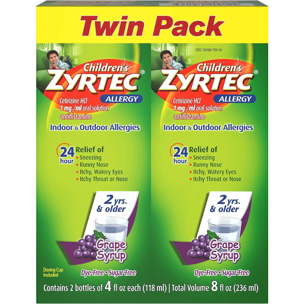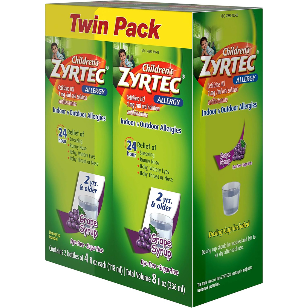 Children’s Zyrtec Allergy Syrup relieves indoor and outdoor allergy symptoms in children. With 5 milligrams of cetirizine hydrochloride in each 5 mL, this over the counter children’s allergy medicine offers 24 hour relief from common symptoms of hay fever and other upper respiratory allergies. Children’s Zyrtec provides consistently powerful relief for your kids’ allergies and helps treat symptoms such as runny nose, sneezing, itchy watery eyes, and itchy nose and throat. Suitable for children ages two years and up, Children’s Zyrtec Allergy Syrup is dye-free, sugar-free and available in a variety of kid-friendly flavors.